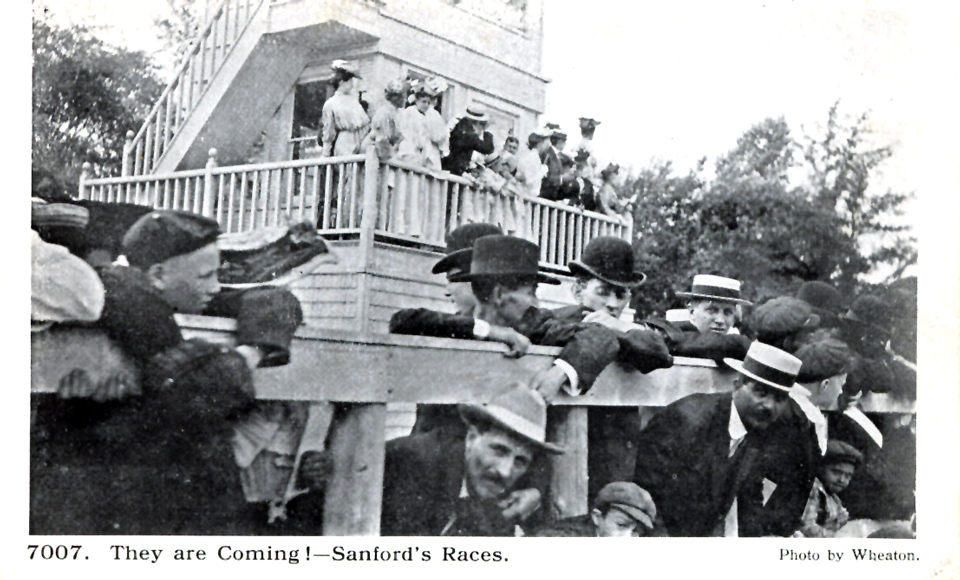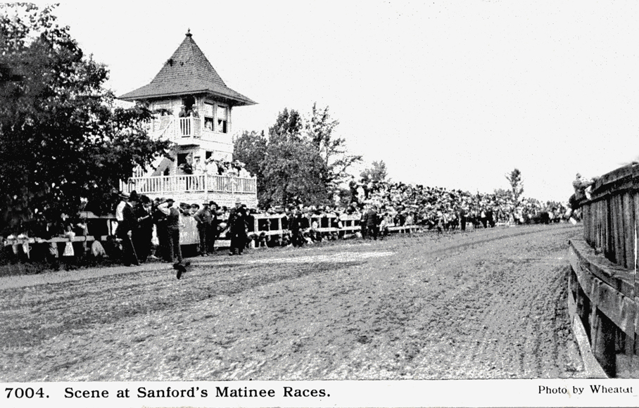The Sanford Farm track was not just for exercise. Just after the turn of the twentieth century, racing was a popular afternoon attraction, based on the crowds along the rail, the carriages parked in the infield, and this locally-produced series of postcards.